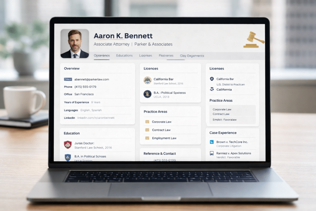 - Firms search and screen using real data. They can filter by practice area, experience level, and availability instead of guessing from a resume.