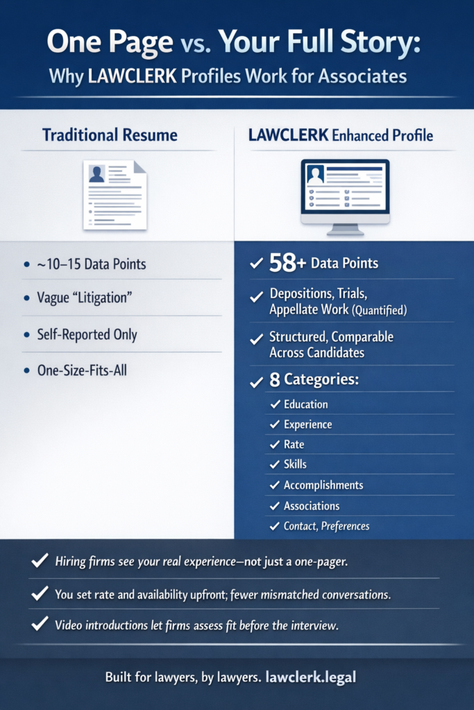 Traditional job applications rely on a resume—maybe 10 to 15 data points. LAWCLERK’s platform is built around an Enhanced Profile that captures 58+ discrete data points across eight categories: education, work experience, rate and availability, skills and tools, accomplishments, professional associations, contact and marketing, and preferences.